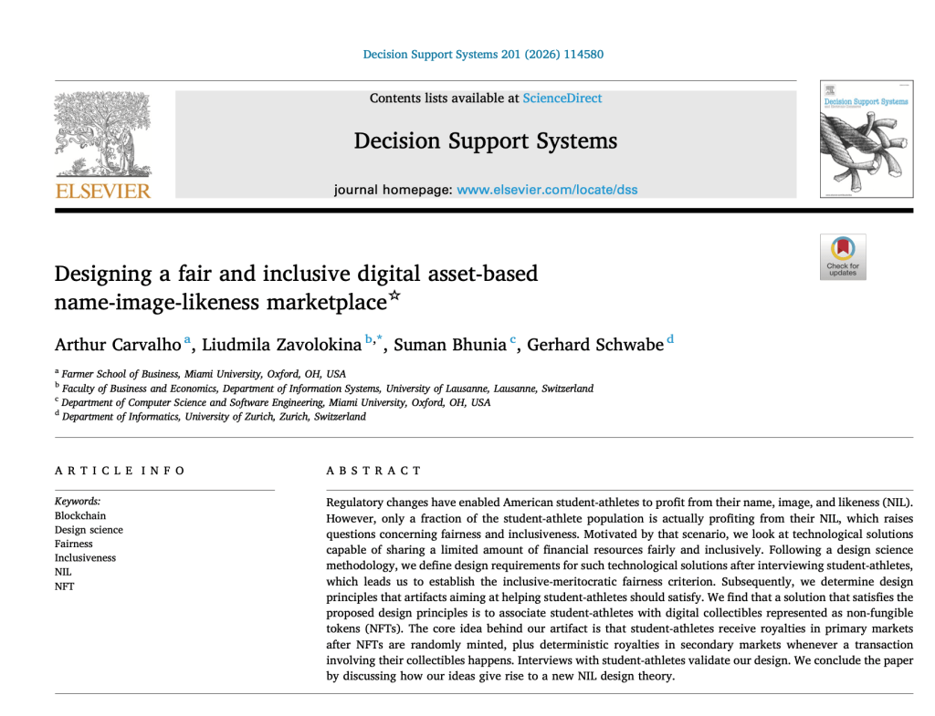 Our new publication with Arthur Carvalho, Suman Bhunia & Gerhard Schwabe: “Designing a fair and inclusive digital asset-based name-image-likeness marketplace” is now out in Decision Support Systems journal.